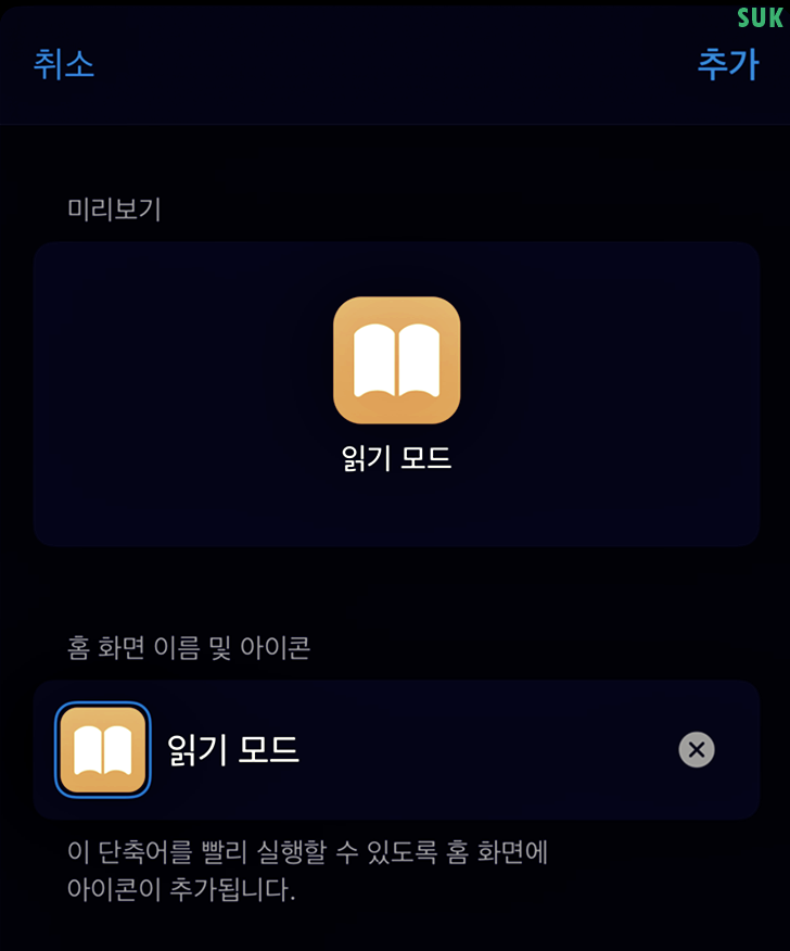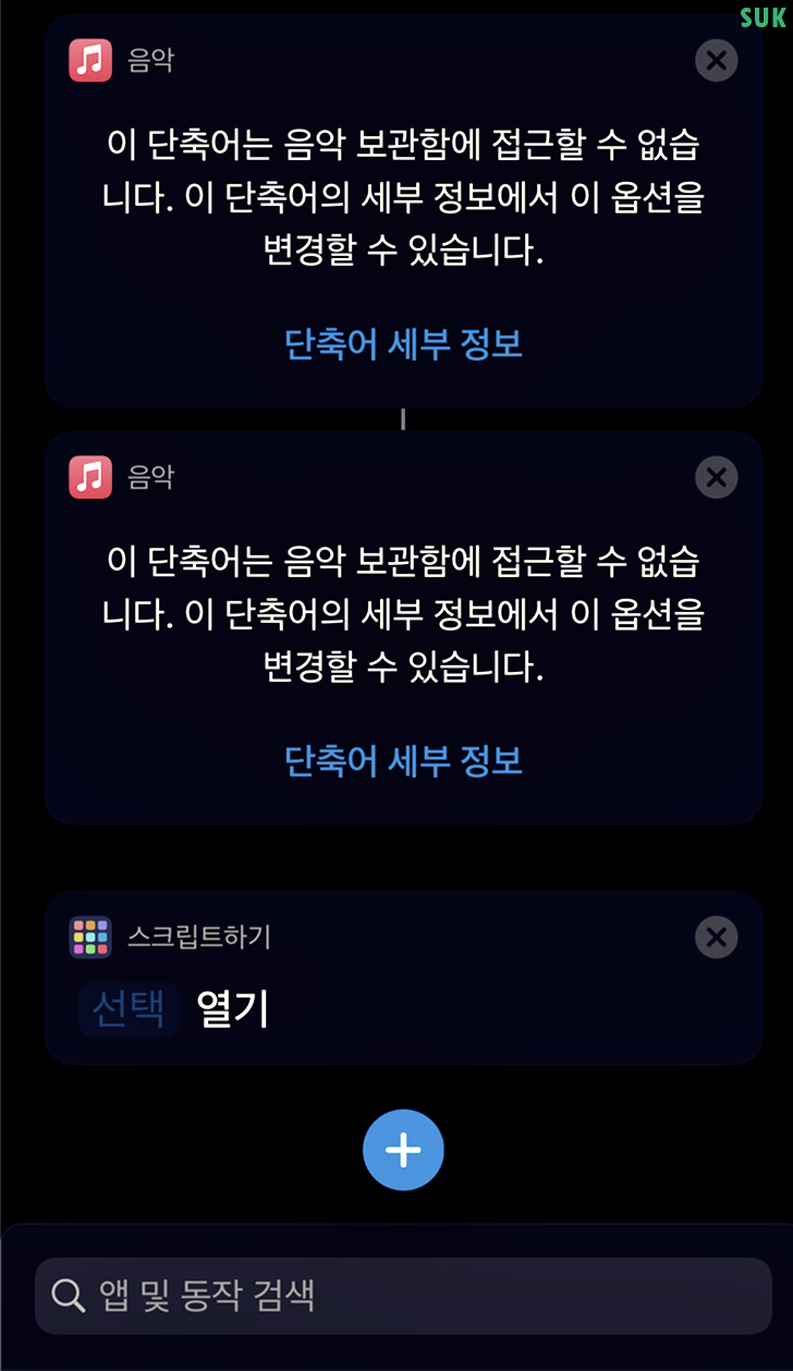 해당 항목을 선택하면 아래와 같은 화면을 확인해보실 수 있습니다. 이 곳에서 일단 복잡한 설정은 뒤로 하고 바로 가장하단 단축어 추가 버튼을 선택해 주도록 합니다.