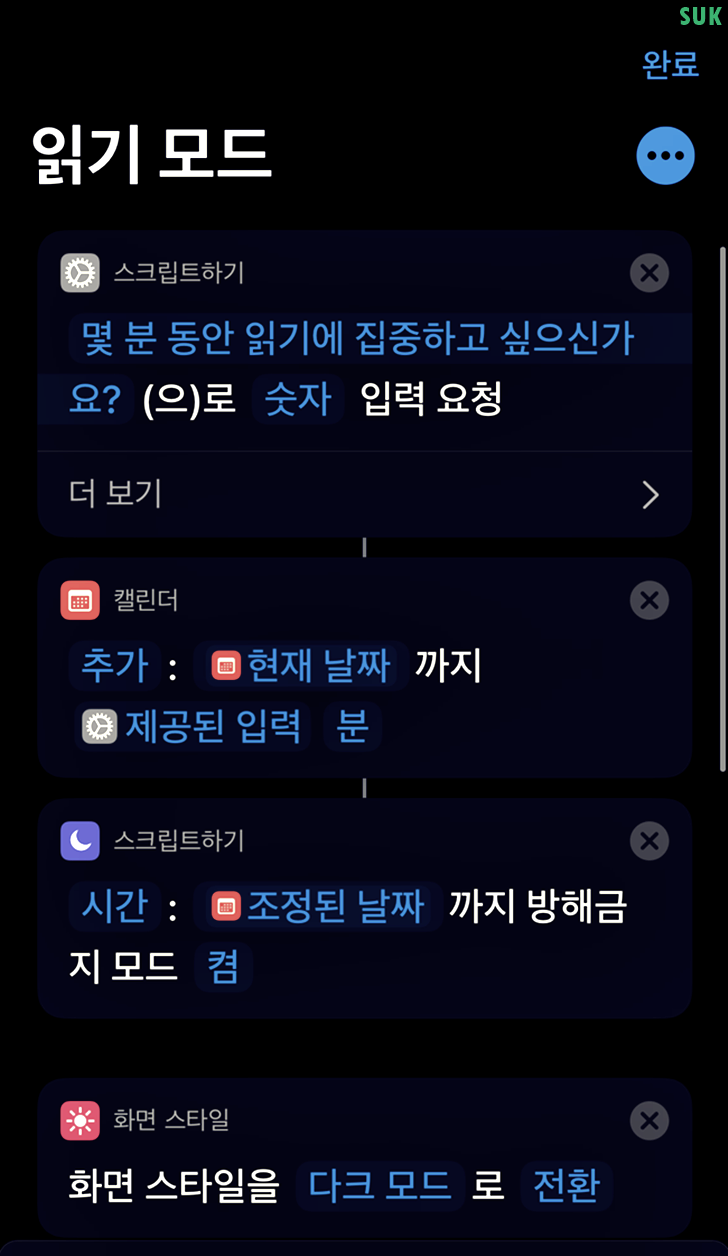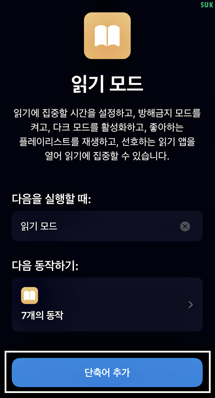 특정 독서 앱을 실행하면 자동으로 음악을 재생해주고 나이트쉬프트 모드 및 다크모드로 변경하실 수 도 있고, 단축어 한방으로 집까지의 네비게이션이 자동으로 실행되며 평소에 즐겨 듣던 음악을 자동으로 재생 하실 수 도 있습니다.