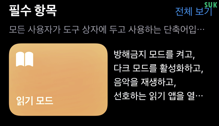 다시 이전 화면으로 돌아오시면 자동화 제안 > 사용자의 앱으로 만들 수 있는 단축어 화면을 지나시면 필수 항목이라는 영역을 확인해 보실 수 있습니다. 이 곳에서는 더욱 다양하고 편리한 단축어 모음을 확인해 보실 수도 있습니다.