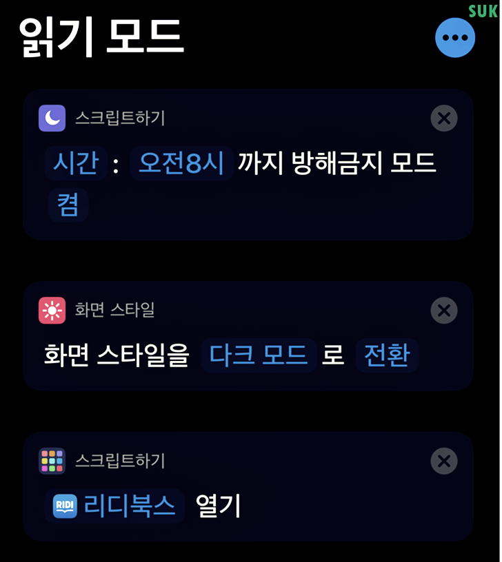 저는 간단하게 지울것은 지우고 아래처럼 리디북스를 열면 방해금지모드와, 다크 모드가 켜지도록 셋팅을 해 두었습니다.